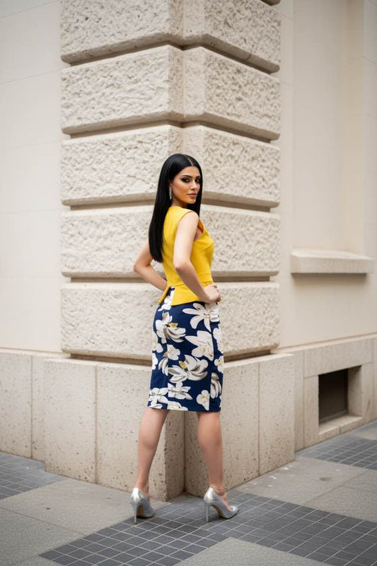 HOMEYEE YELLOW/BLUE PENCIL DRESS SIZE M
