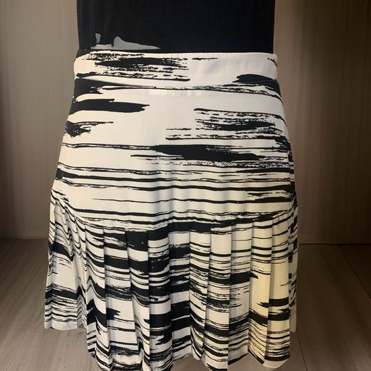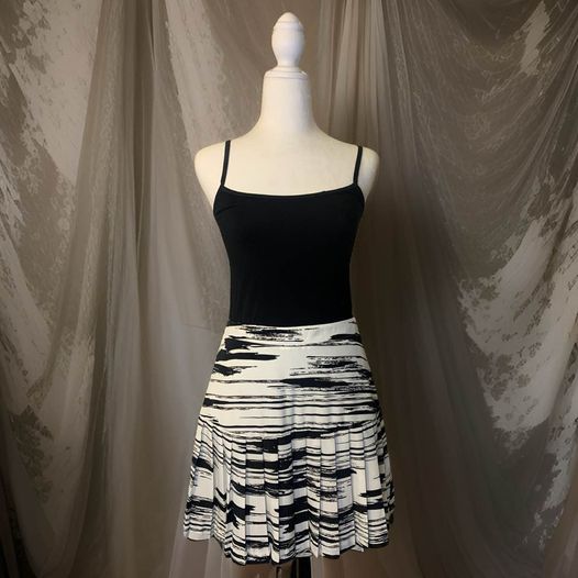 Upgrade your wardrobe with this expertly crafted Banana Republic Pleated Mini Skirt. Featuring a side zipper closure and lined upper panel, this skirt offers a sleek and structured silhouette. The black and white abstract fabric adds a touch of uniqueness. Perfect for any occasion, this skirt is a must-have for any fashion-forward individual. Retails 59.00 17.5 inches in length, waist 30 inches