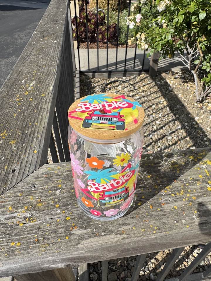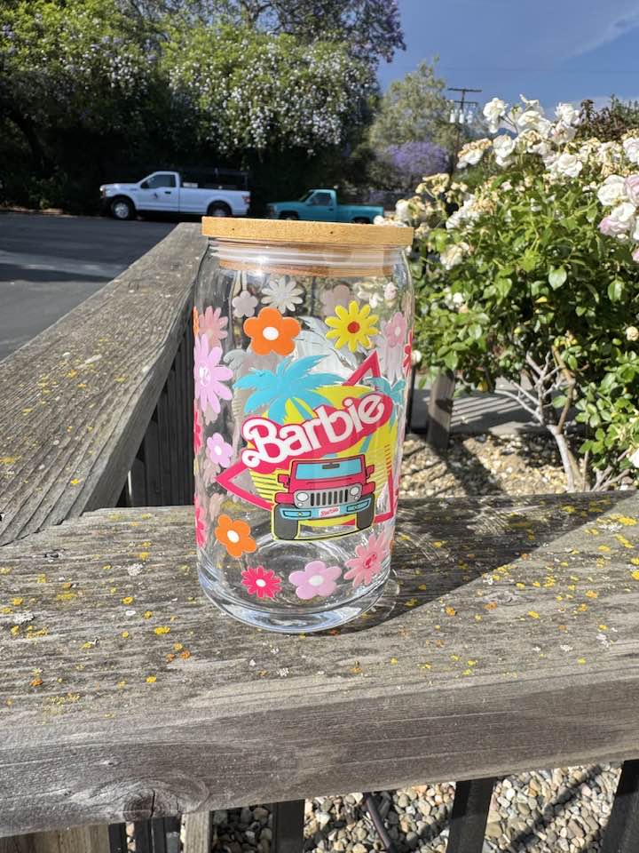 Rev up your refreshment routine with this SUPER CUTE Barbie Jeep Glass Cup! This 16oz thirst-quenching chariot comes with its very own glass straw for stylish sipping adventures. Drink like you're cruising down the boulevard of dreams! Just holler for the optional plaid lid and you'll be all set for splash-free fun wherever your day takes you. The perfect companion for Barbie fans and beverage enthusiasts alike!