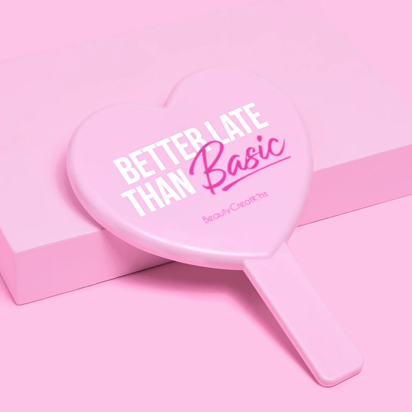 Our Better Late Than Basic Heart Handheld Mirror is the perfect addition to your daily beauty routine. The pink mirror is made of durable plastic, and proudly displays the words "Better Late Than Basic". Enjoy its lightweight and portable size, perfect for travel.