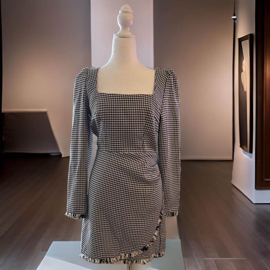 This Black and White Checkered Dress size M is a must-have addition for any fashion-forward wardrobe. The playful tassel detailing around the sleeves and bottom of the dress adds a touch of charm to the overall design. Made with quality materials, this dress offers both style and comfort. waist 32 Length 18 inches
