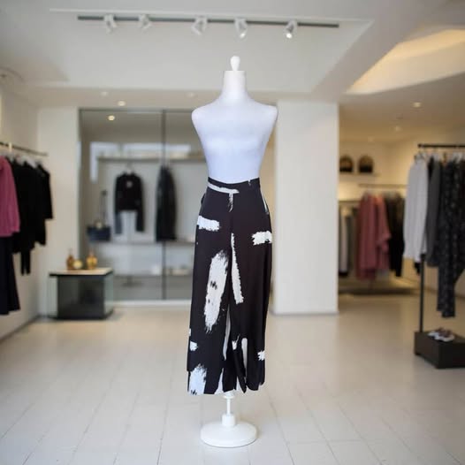 Turn heads in these playful black and white wide-leg pants, designed with striking paint-like stripes for a truly unique look. With a 27-inch waist, 29.5-inch inseam, and a full length of 42.5 inches, they offer a comfortable yet dramatic fit. A convenient back zipper adds a sleek touch, making these pants your go-to for effortless, artistic style.