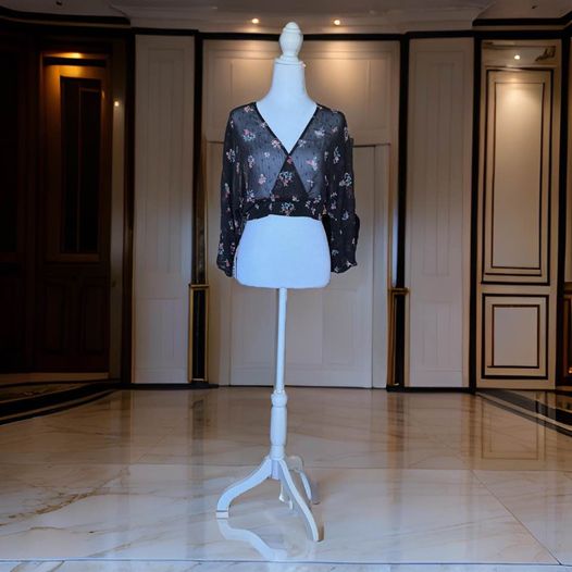 Elevate your style with our Black Floral Top in size M. Featuring a stunning sheer design, a tie back, and a keyhole opening, this top offers a versatile and effortless elegance. Enjoy 16-inch in length and wide sleeves and a 34-inch waist with adjustable tie back for a perfect fit.