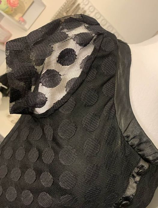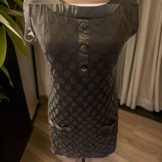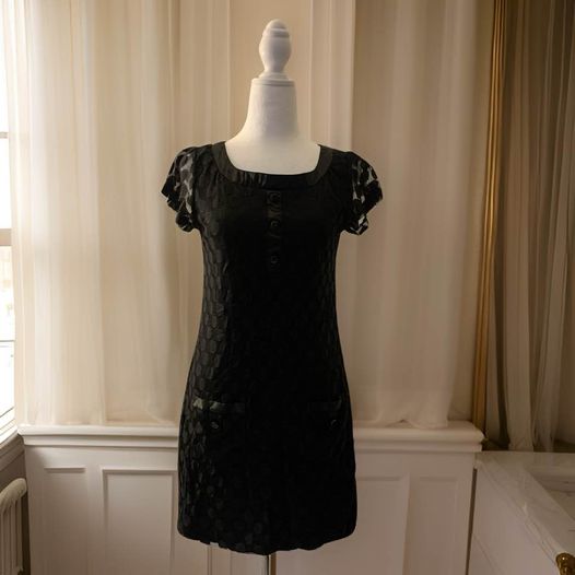 Upgrade your wardrobe with the versatile and fashionable Black Polka Dot Dress. This elegant dress features sheer sleeves, accented with buttons, and includes two convenient pockets, this dress will add a touch of sophistication to any occasion. From shoulder to hem 33 inches in length, from armpit to armpit 16.5 inches, waist 16 inches