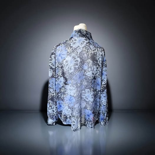 This super cute blue floral blouse is perfect for layering! Sheer with lined sleeves for comfort, it adds a breezy, stylish touch to any outfit. Previously owned with the size label removed, it measures 26 inches long and 25 inches wide from armpit to armpit—ideal for a relaxed, playful fit.