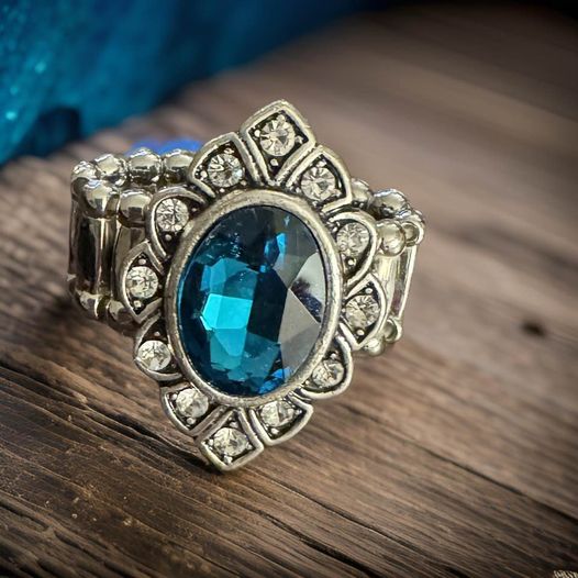 The Blue Ring offers a touch of elegance with its beautiful blue gem surrounded by sparkling rhinestones. Its stretchy band allows for a comfortable fit for most sizes. Enhance your style and add a pop of color to any outfit with this stunning accessory.