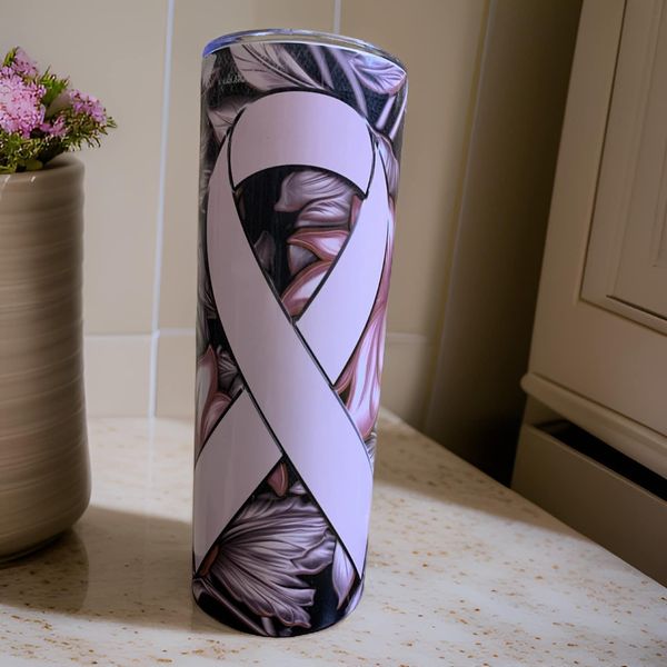 Raise awareness for cancer with our 20oz tumbler featuring a pink ribbon. Show your support while enjoying a refreshing drink. A portion of proceeds goes towards cancer research.