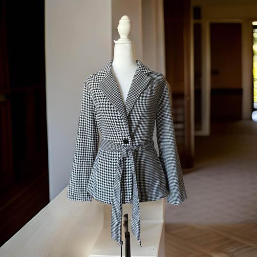 Expertly crafted professional jacket with a fashionable tie belt and versatile button-down design. Elevate your style with a chic skirt or maintain a polished look with tailored slacks. The choice is yours with this timeless checkered jacket. 100% polyester