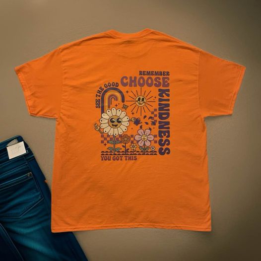 This orange t-shirt features a happy pocket flower and a reminder to "Choose Kindness" on the back. Spread positivity and see the good with this fun and vibrant shirt. Stay motivated with the simple reminder that "You Got This."