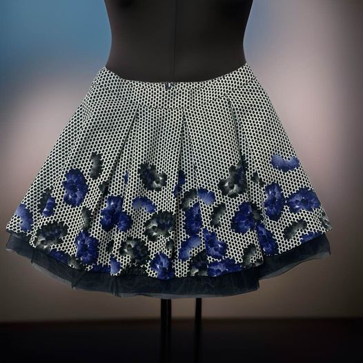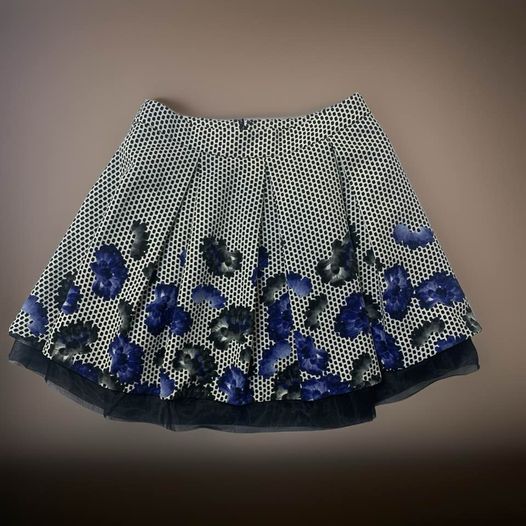 As a fashion expert, I introduce to you the Cobalt Blue Floral Skirt. This super cute, pleated skirt features a touch of lace at the hem, giving it a feminine and elegant touch. The beautiful cobalt blue floral pattern with a touch of black is sure to make a statement. Elevate your wardrobe with this versatile and stylish piece. 18.5 inches in length, waist 28 inches