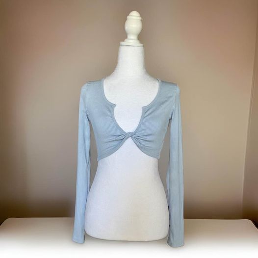Elevate your wardrobe with our lightweight and versatile Crop Sweater with a stylish twist in the front. Crafted with a stylish light blue hue, this super cute crop sweater can be paired with a tank for a casual summer look or dressed up with jeans for a chic fall ensemble. Available in a size XS.