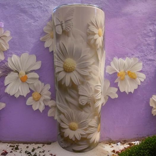 This 20oz steel tumbler with its white butterflies and white daisies design is perfect for daisy lovers. Treat yourself with this stylish and durable tumbler: lasting insulation for hot or cold beverages and an eye-catching design.