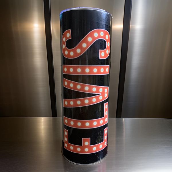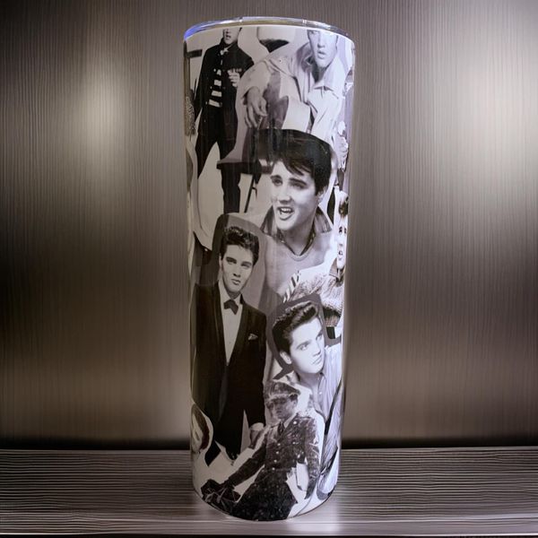 Introducing the Elivs 20oz tumbler, a must-have for Elvis fans. With its chic, vintage design, this tumbler is perfect for enjoying your favorite beverage while paying homage to the King of Rock and Roll. Plus, its 20oz size allows for longer lasting refreshment. A stylish accessory for any Elvis aficionado.