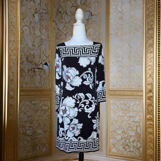 This elegant Floral Black Dress boasts a stunning white floral design and unique details on the hem, collar, and sleeves. Stretchy and versatile, it is 35 inches long and has a waist of 32 inches, this dress has a stretch fitting up to a medium size. Perfect for a dinner party, this dress combines beauty and comfort effortlessly.