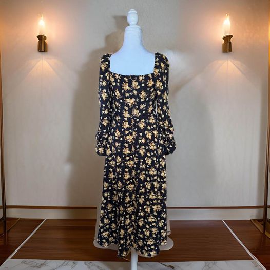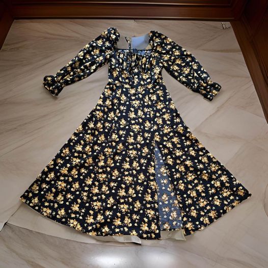 Expertly crafted in a super cute peasant style, this Floral Yellow Dress features a black base with vibrant yellow flowers. With a stylish slit down the side and a zipper in the back, this dress is not only charming but also practical. Measuring 46 inches in length and with a waist of 28 inches, it is the perfect size small for any occasion.