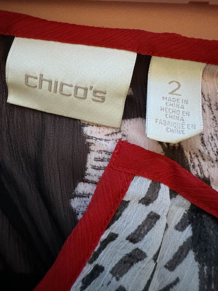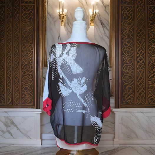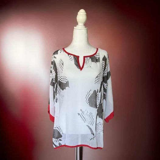 Introduce a unique addition to your wardrobe with this flowy blouse from Chico's, size 2. The sheer material features a striking combination of black and white, accented with red detailing. The slightly longer back adds a touch of elegance to this versatile piece, measuring 26 inches in the front and 27 inches in the back, with a waist measurement of 48 inches. Elevate your look with this stylish and flattering blouse.