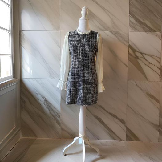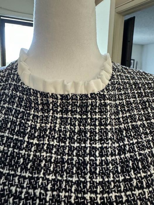 This gray and white dress is perfect for a professional look at work. Made with wool, it features a stylish ruffle neck and a convenient zipper down the back. Available in size M for a comfortable fit. Look confident and polished in this dress. From shoulder to hem 31 inches in length, arm pit to arm pit 17 inches, waist inches