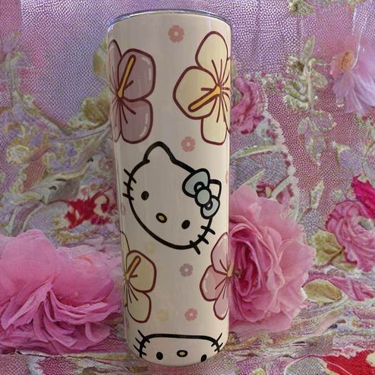 This 20oz steel tumbler features a super cute Hello Kitty surrounded by Hawaiian flowers to brighten up any room. Be the envy of your workspace with this stylish tumbler.
