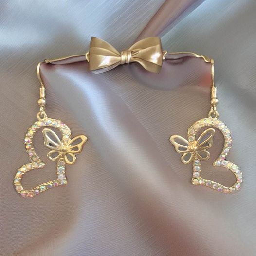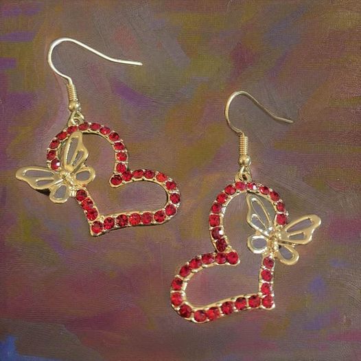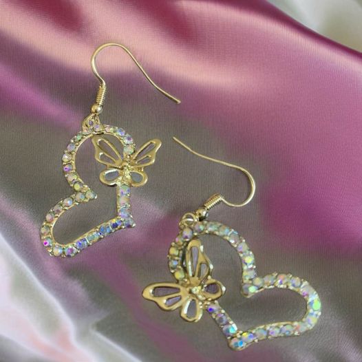 These Heart/Butterfly Earrings will add a classic touch of sparkle and elegance to any outfit. Crafted from gold and featuring an iridescent or red rhinestone, these beautiful pieces are designed for subtlety and comfort. The perfect accessory for any stylish look. BIN 2