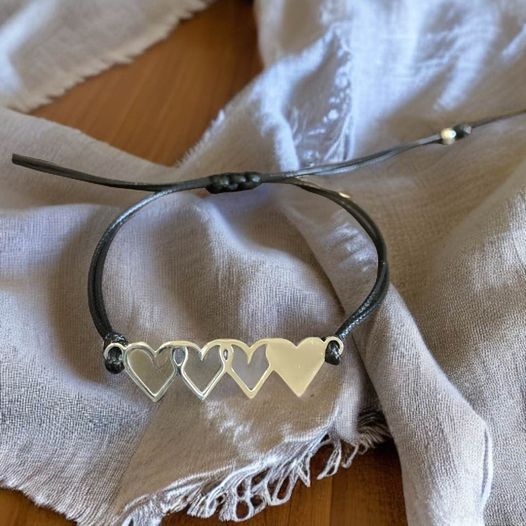 This Heart Leather Pullcord Bracelet offers a stylish and modern accessory. Crafted with sleek silver and four hearts, this thin leather pullcord bracelet will elevate any outfit. Get ready to make a stylish statement.
