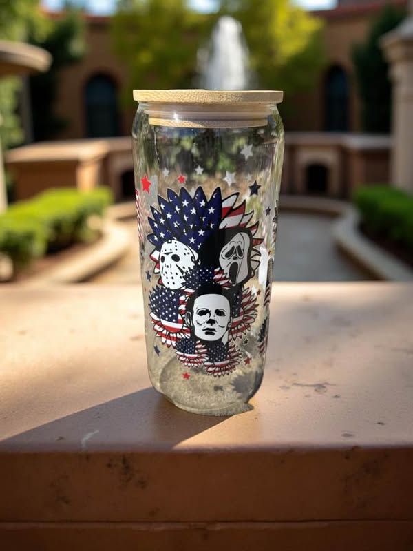 Celebrate Independence Day with some spooky fun! This set of Horror 4th of July friends is perfect for your party, with a capacity of 20oz. Includes a bamboo lid and glass straw for an eco-friendly twist. Get ready for a frightfully good time!