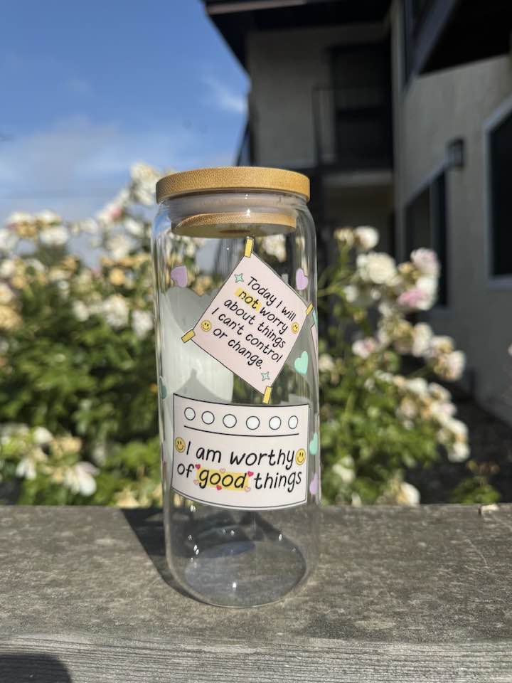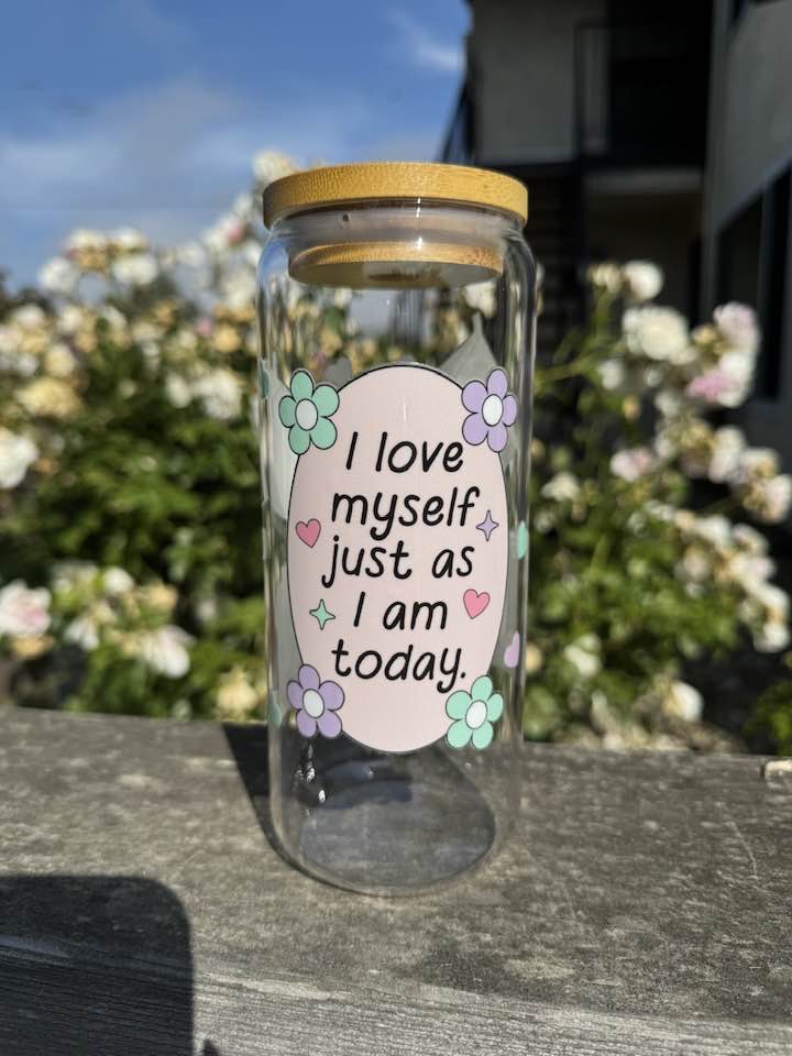 Brighten your day with the "I Love Myself Just As I Am Today" 20oz glass cup. Complete with a sleek glass straw, this cup lets you sip your favorite drink while soaking up a daily dose of inspiration. Perfect for staying hydrated and feeling fabulous all day long!