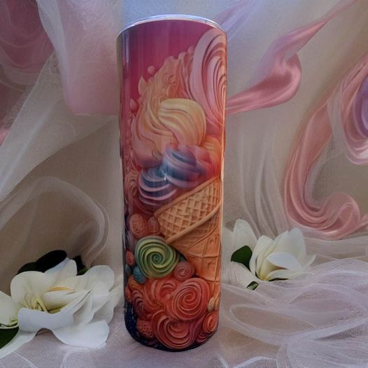 This 20 oz steel tumbler features a colorful and artistic ice cream cone with beautiful colors and swirls. Keep your beverage at the perfect temperature in style. Enjoy your cold or hot treat with a hint of artistic flair.
