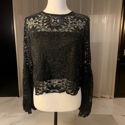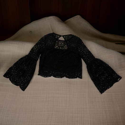 This lace blouse features beautiful bell sleeves with an open back, perfect for a night out. The delicate lace adds an elegant touch, making it a versatile and stylish addition to any wardrobe. Feel confident and chic with this must-have top. Laid flat across chest 18 inches