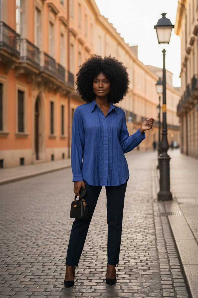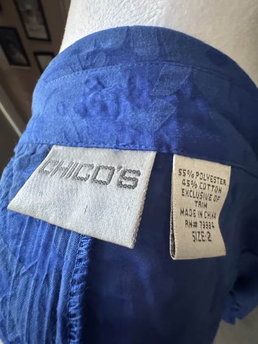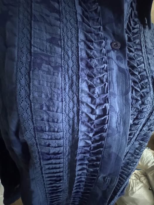 Add a splash of midnight magic to your wardrobe with this unique blue blouse, bursting with charming details! Sized at 2, it measures 25.5 inches long and 21.5 inches wide from armpit to armpit, ensuring a comfy and flattering fit. Perfect for those who love to blend elegance with a playful twist.