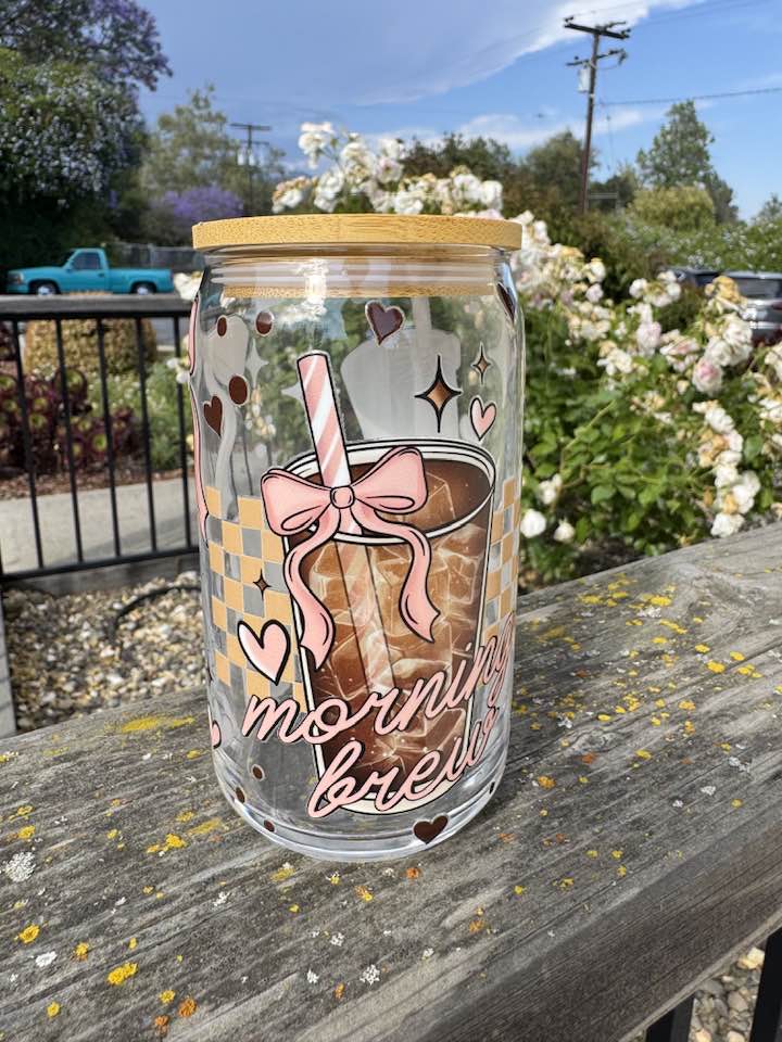 Wake up your beverage game with our MORNING BREW GLASS CUP! This 16oz glass charmer sports an ultra-cute lid design that'll have you smiling before your first caffeine hit. Comes with a snazzy glass straw for splash-free sipping adventures! Not feeling the cuteness overload today? Just holler for a plain lid instead! Your drinks deserve to party in this fun little number—morning, noon, or whenever!