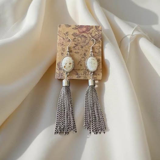 Add a touch of Victorian charm to your look with these Mother of Pearl Tassel Earrings. Featuring shimmering mother of pearl stones paired with delicate silver tassels, they bring a playful yet elegant vibe to any outfit. Perfect for adding a little sparkle and whimsy to your day!