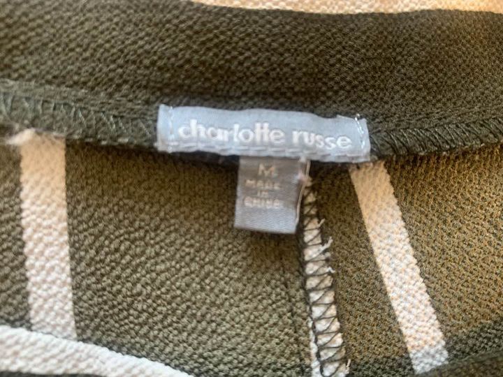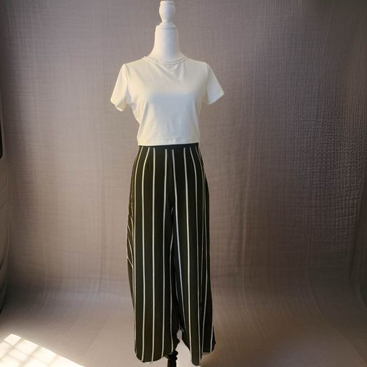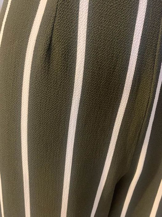 These olive-green flowy pants with white pin stripes are not only stylish, but also practical with a convenient side zipper. The lightweight fabric creates a comfortable fit for all-day wear. Perfect for any occasion, they add a touch of elegance to your wardrobe. 41inches in length, inseam 30 inches in length, waist 28 inches