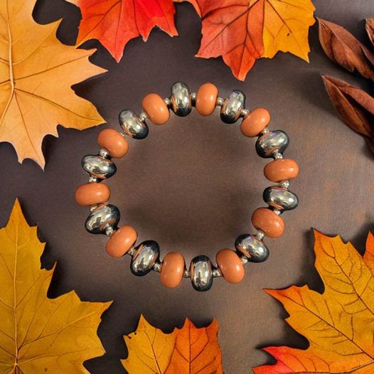 This Orange & Silver Bracelet features a combination of orange and silver beads, creating a unique fashion accessory perfect for the fall season. The stretchy design makes it comfortable and easy to wear.