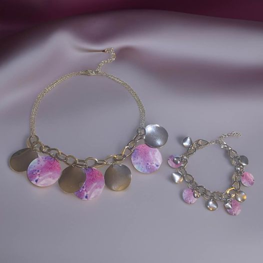 This set includes a Paint Splat Necklace and Bracelet. The metal discs make for a super cute addition to any outfit, perfect for dressing up or down. Stand out from the crowd with this unique jewelry set.