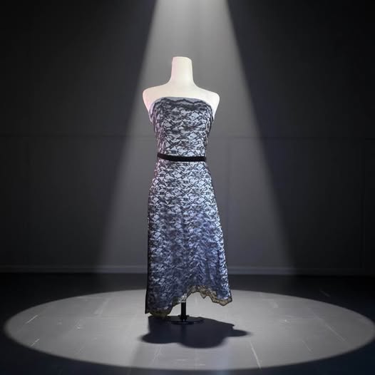 This playful and elegant strapless dress boasts a delicate black lace overlay with a soft light blue lining for a charming look. Crafted to flatter, it features a 26-inch waist, 28-inch bust, and measures 40 inches in length for a party-ready fit. The back ribbon ties into a sweet bow, adding a flirty touch. Previously owned with the tag removed, this size small dress blends classic elegance with fun style, perfect for turning heads at any celebration.