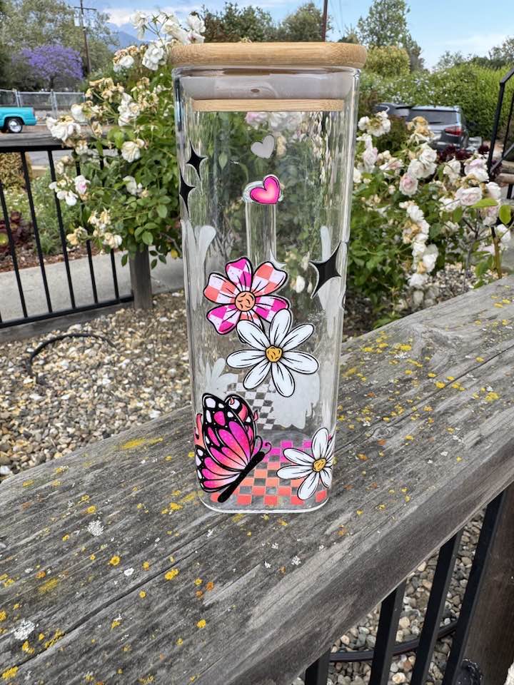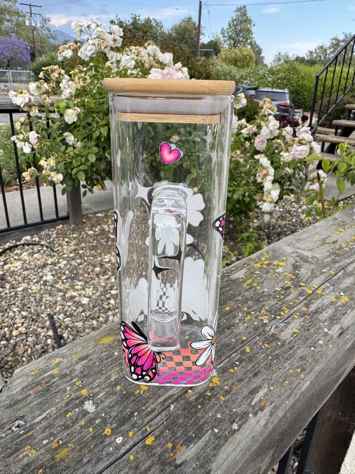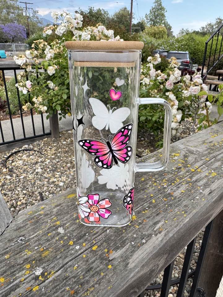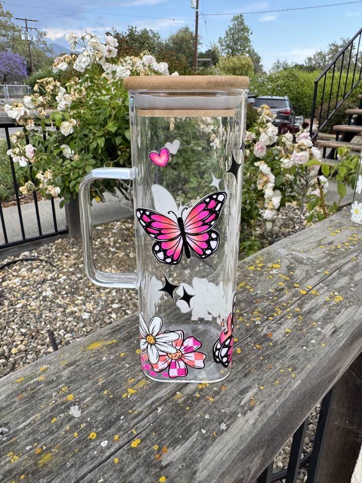 Sip your favorite drinks with a splash of whimsy using the 16oz Pink Butterflies Glass Cup. This charming cup features a sturdy handle for a comfortable grip and comes with a matching glass straw, perfect for smoothies, iced coffee, or any refreshing beverage. The delightful butterfly designs add a playful touch to brighten your day. It includes a decorative lid, but if you prefer a plain one, just ask!