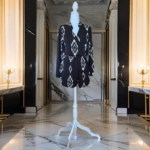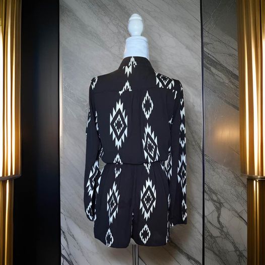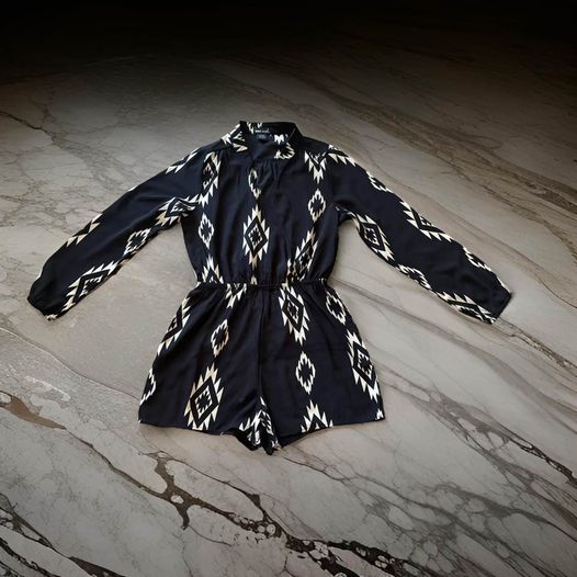 This black and tan romper is both stylish and versatile. With an elastic waist and 30.5-inch length, it can be dressed up or down for any occasion. The unique design adds a touch of sophistication, making it a must-have in any wardrobe. Available in size M with a 26-inch waist (without stretch).
