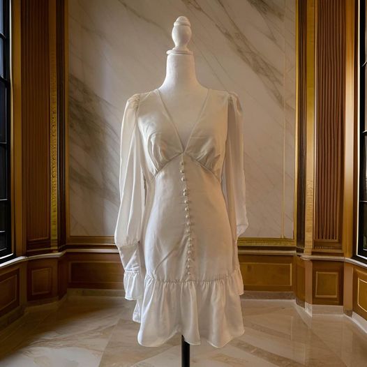 This elegant satin dress features a low-cut front with decorative buttons and a beautiful ruffle on the bottom. The long sleeves with ruffled cuffs add a touch of sophistication. Perfect for any special occasion, this dress will make you stand out with its stylish design. Size M Waist 30 inches, Length 34 inches
