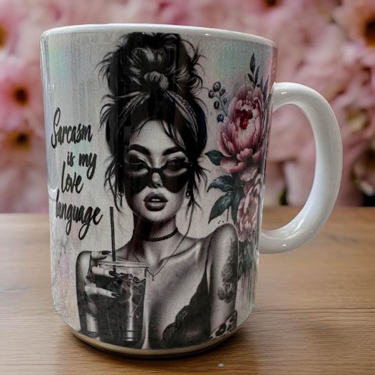 Sarcasm Mug: Show your love for the art of sarcasm with this 11oz mug. Perfect for any coffee drinker, this mug adds attitude to your morning routine. Let everyone know your wit and humor with the bold statement, "Sarcasm is my love language".