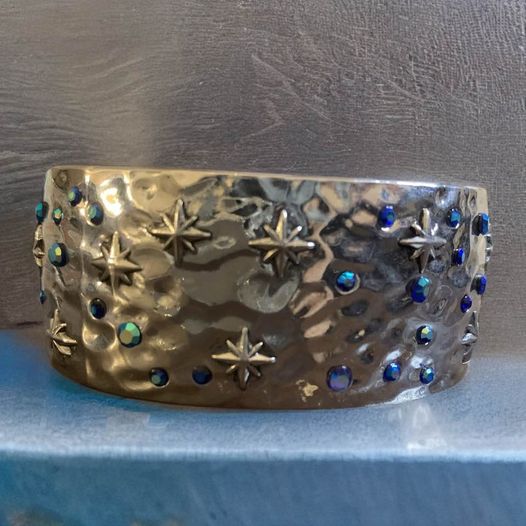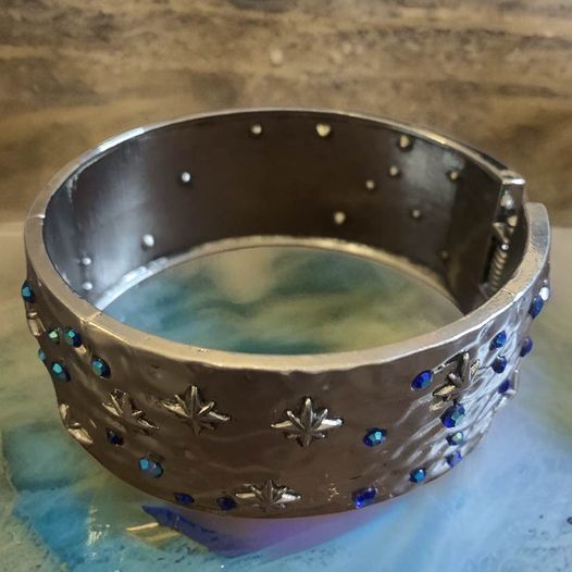 This silver and blue crystal cuff is sure to be a showstopper. Crafted from thick steel with an easy-to-utilize hinge mechanism, this cuff is both strong and eye-catching. With its beautiful shades of blue, this cuff is sure to become your favorite accessory.