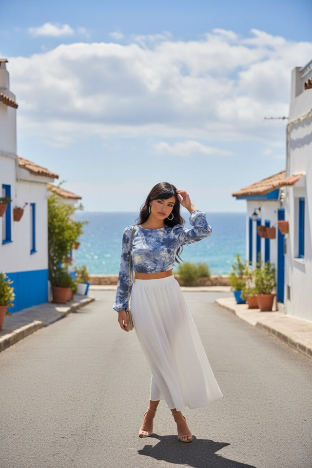 This playful sky blue and white tie-dye crop top adds a fun twist to your outfit with its sheer sleeves and a charming keyhole detail in the back. The elastic bottom ensures a comfy fit, while the 14-inch length from shoulder and 19-inch chest width offer a flattering silhouette. Perfect for sunny days and carefree vibes!