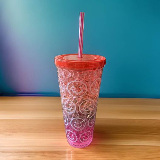 Introducing the Smiley Faces cup - the perfect cup to brighten up your drinks! This cup features a double wall design and a fun straw that adds a touch of playfulness to your sips. Plus, with its gel freezer technology, your drinks will stay chilled for longer. Enjoy your cold beverages in style with this cup!