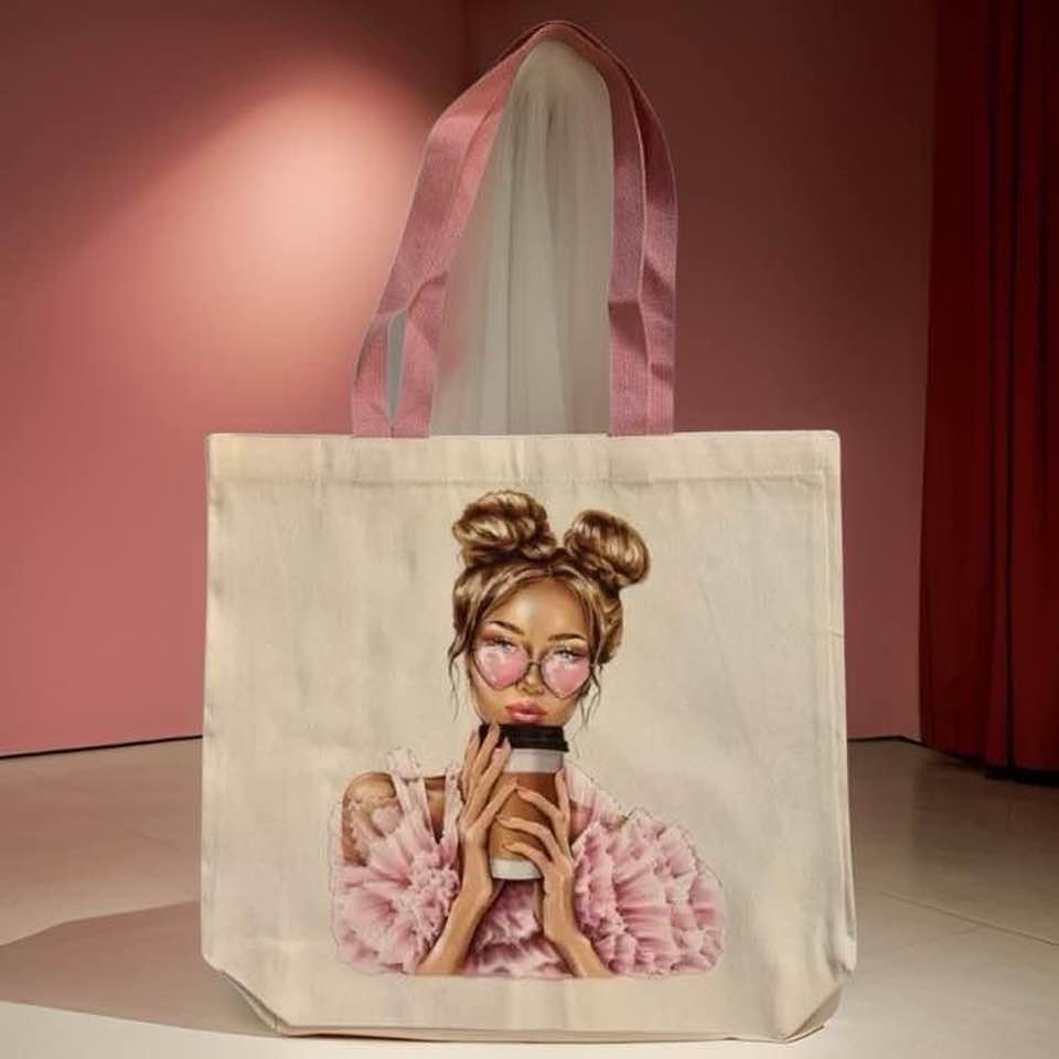 Bring your style to the next level with this unique Space Buns tote bag. Constructed of beautiful tan fabric with trendy pink straps, this bag has a spacious interior of 15.7x15, perfect for carrying your everyday necessities in style.