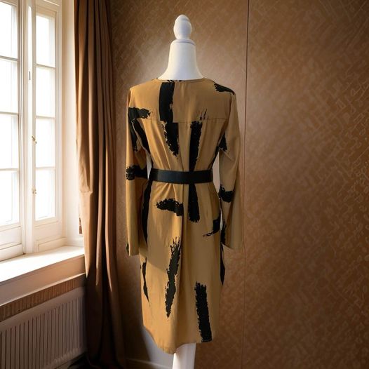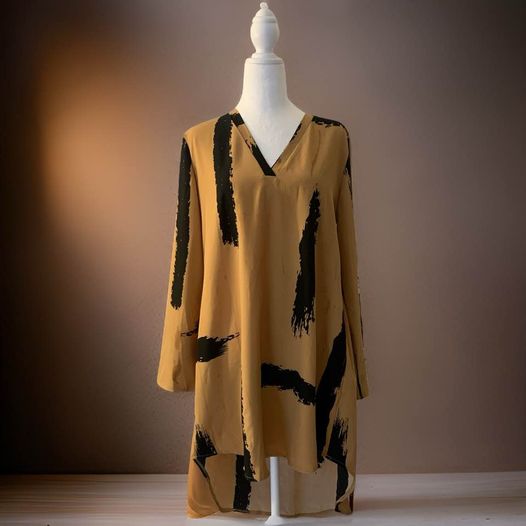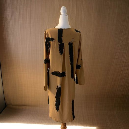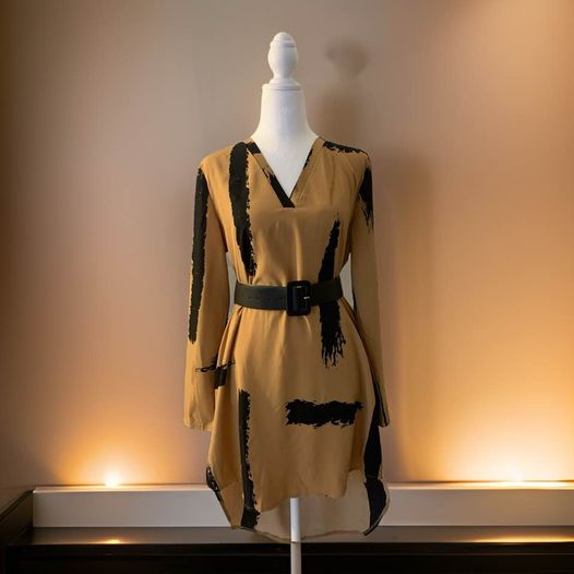 This tan/black dress is perfect for standing out in a crowd. With a unique design featuring a shorter front and longer back, and the option to wear with or without a belt, you'll make a statement no matter where you go. Perfect for those who want to add a touch of individuality to their wardrobe. Front from shoulder to hem 33.5 inches, back 38.5 inches, waist 38 inches