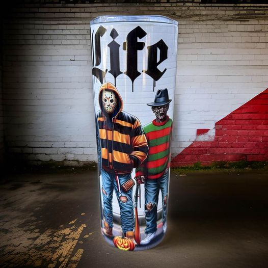 Introducing The Thug Life - a 20oz stainless steel tumbler perfect for the spooky season and hanging out with your horror friends. Stay hydrated in style with this durable, on-the-go companion. Made for adventure and ready for anything.