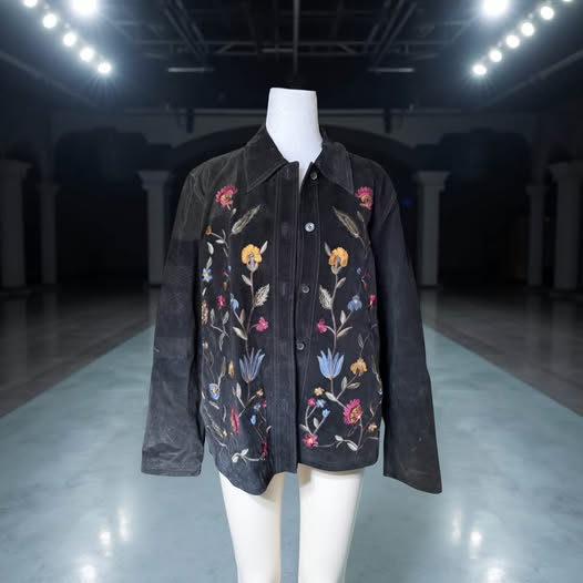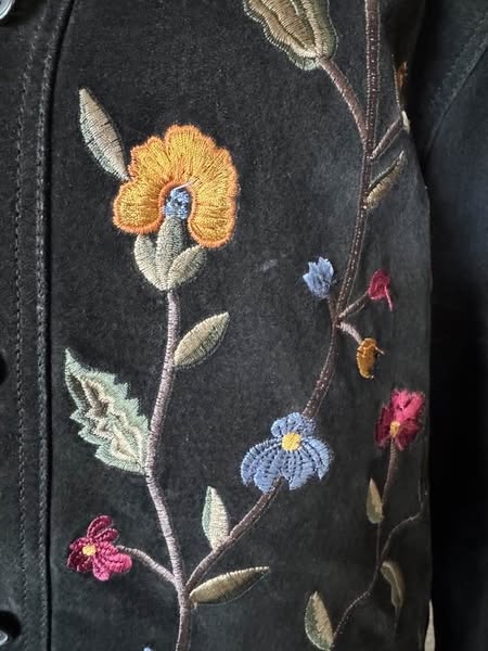 Step out in style with this playful Vintage Brandon Thomas suede jacket, featuring unique floral embroidery that adds a bold, artistic touch. Designed in classic black, it measures 26 inches in length and 22 inches across the width, perfect for size L. This jacket combines vintage charm with eye-catching details, making it a standout piece for any wardrobe.