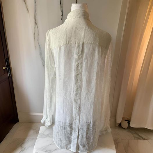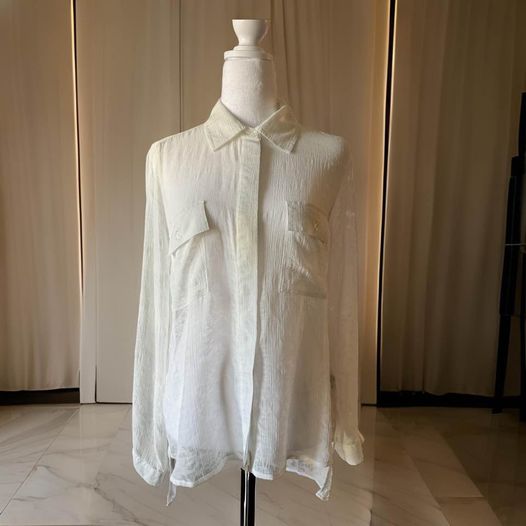 Upgrade your wardrobe with our White Button-Down Blouse in Size M. Made from 100% polyester, its sheer fabric exudes a sophisticated elegance. The versatile design features buttons on both the front and back, with a longer back hem for a touch of modern style. Two front pockets add functionality. Dress up or down for any occasion.
