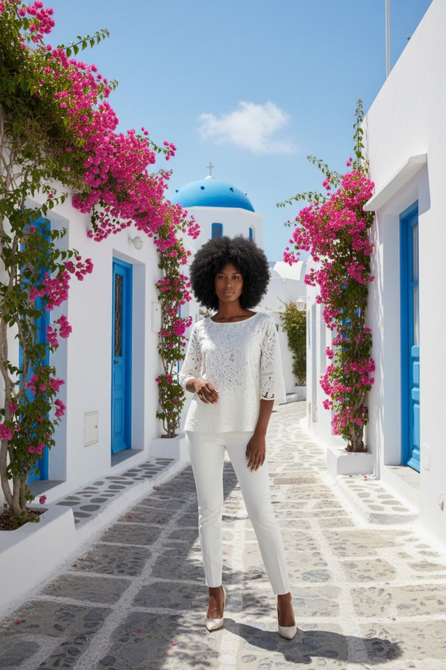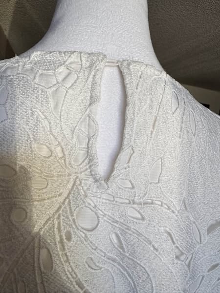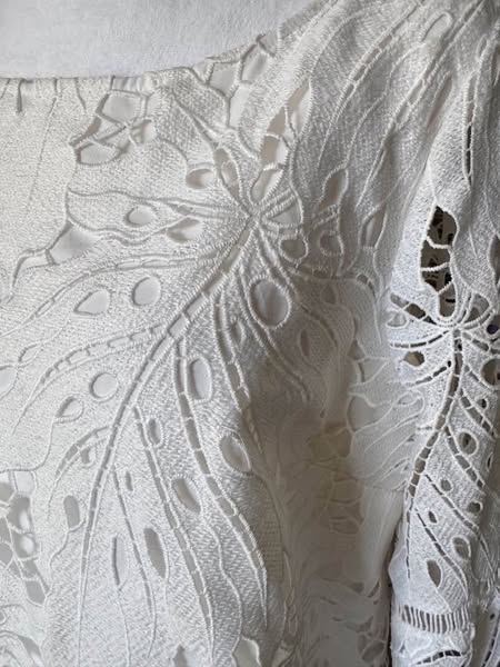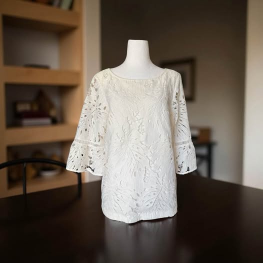 This white laced blouse in size LP is a playful and charming piece for any wardrobe. Lined for comfort, it features whimsical lace bell sleeves and a cute keyhole back detail. With a flattering fit measuring 26 inches long and 21 inches across the armpits, it pairs perfectly with jeans or skirts to add effortless style and fun to your outfit.